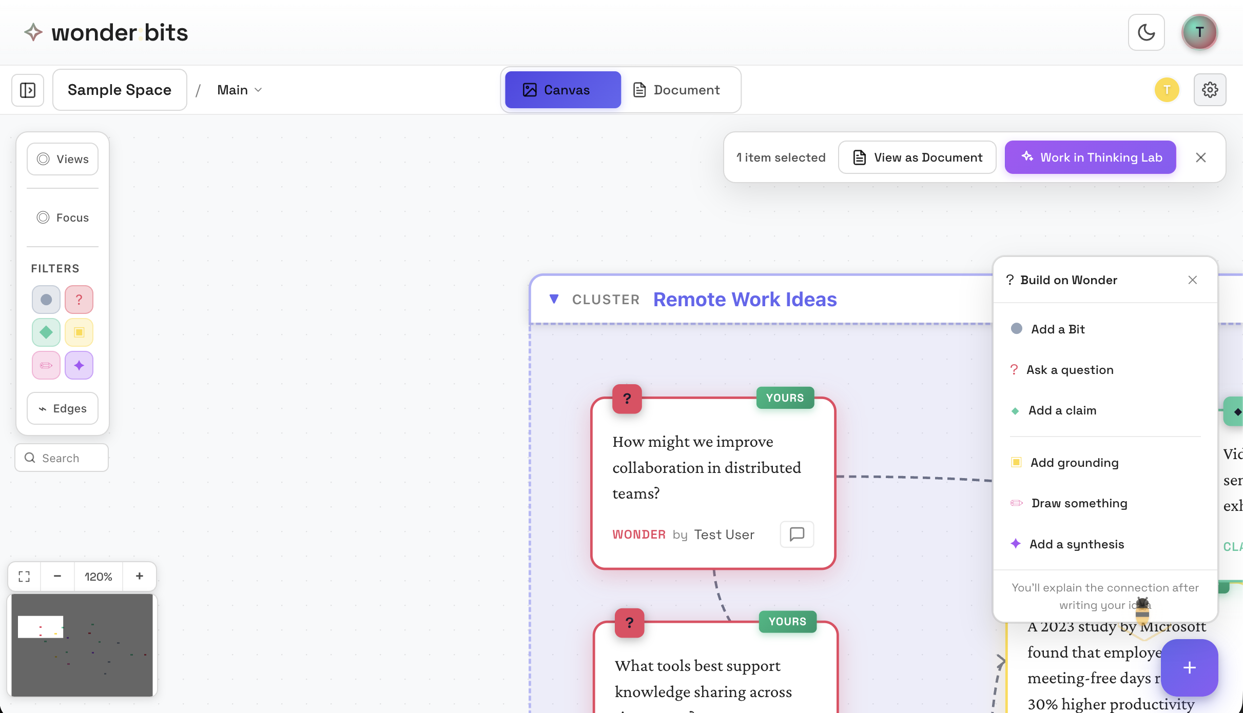 Tip: Use Canvas view for writing, exploration, and organization, then switch to Document view when you want to read through your ideas linearly.