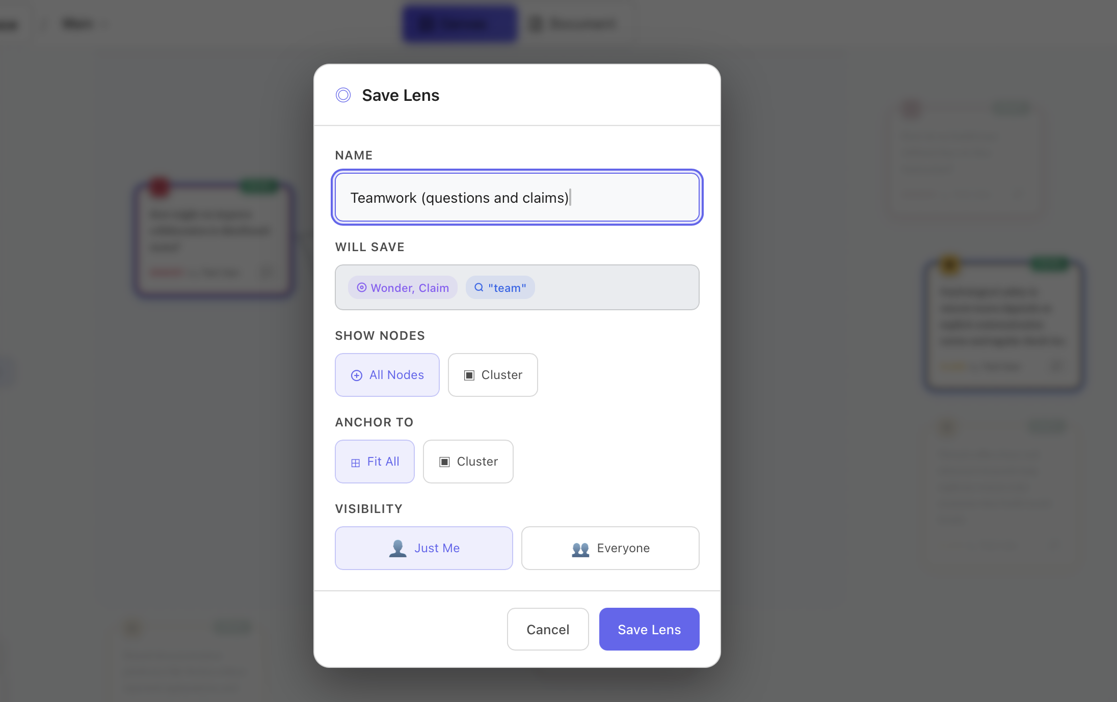 Tip: Create Lenses for different phases of your thinking, like “Questions to explore” or “Key claims”.